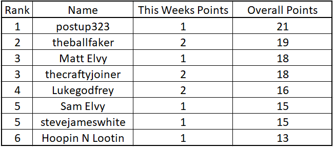 Here are the league standings after week 9. This week includes a bonus round which was to predict the winner of the NBA Cup.